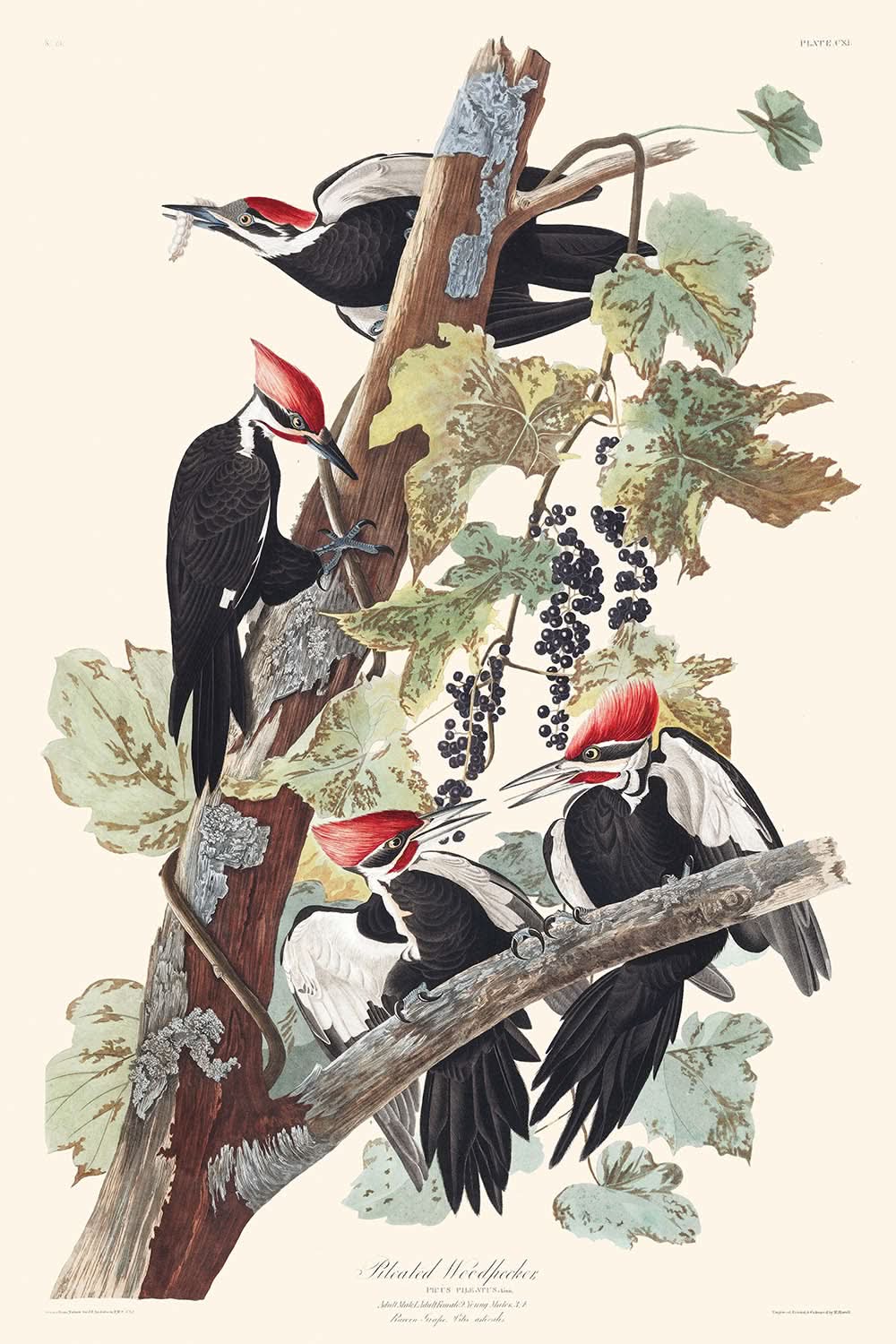 In 1827, John James Audubon introduced the world to the captivating beauty of the Pileated Woodpecker through his illustrious "Birds of America." This meticulously crafted illustration captures one of North America's most intriguing birds, the Pileated Woodpecker, known scientifically as Picus pileatus. Audubon's works are celebrated for their lifelike representation and exceptional attention to detail, making this piece a testament to his profound connection with the natural world.