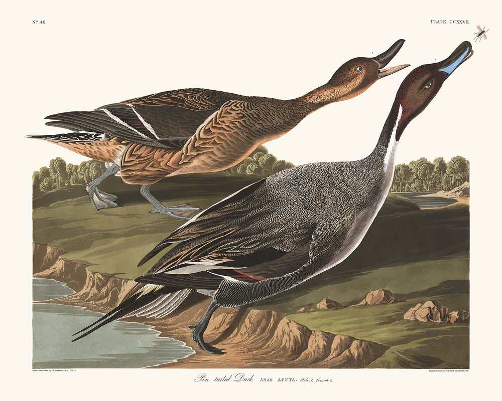"Pin Tailed Duck, Male and Female," first published in 1827, is an exquisite ornithological artwork by John James Audubon, part of his monumental series, "The Birds of America." This artwork captures the intricate details and natural beauty of the male and female pintail duck, set against their natural habitat.