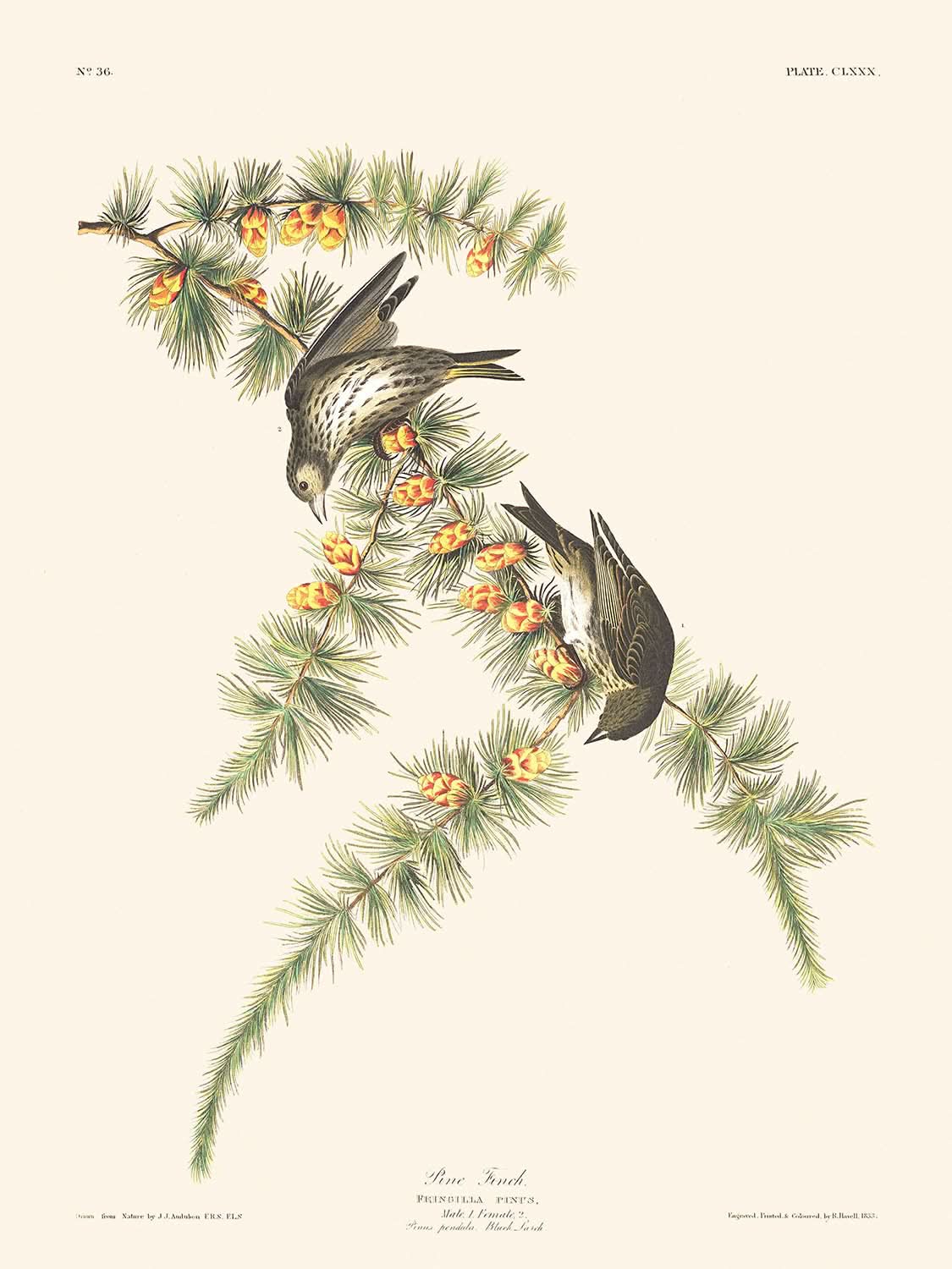 This piece stands out not only for its artistic beauty but also for its scientific significance. Illustrated as Fringilla pinus, the Pine Finch is depicted in its natural habitat, offering a glimpse into its behaviors and migrations which Audubon noted with great precision. The subtle hues and textures in Audubon's design capture the essence of the species, making it an ideal addition for those fascinated by ornithology.