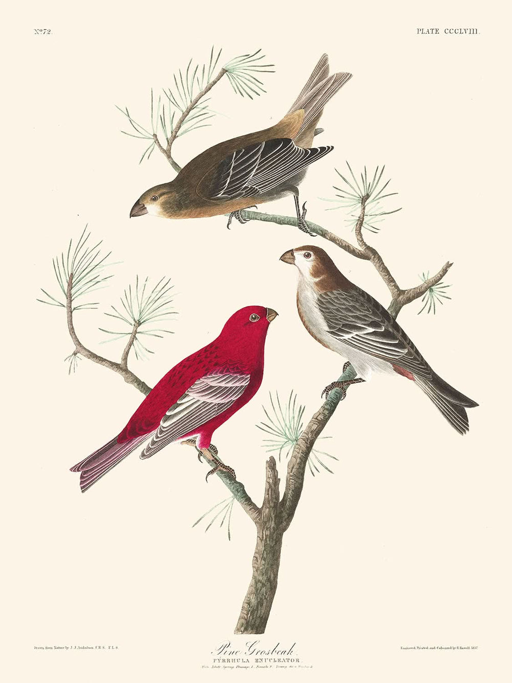 Pine Grosbeak, published in 1827, is one of the exquisite bird illustrations by the renowned naturalist John James Audubon, featured in his masterwork, The Birds of America. This artwork captures the vibrant essence of the Pine Grosbeak in meticulous detail.