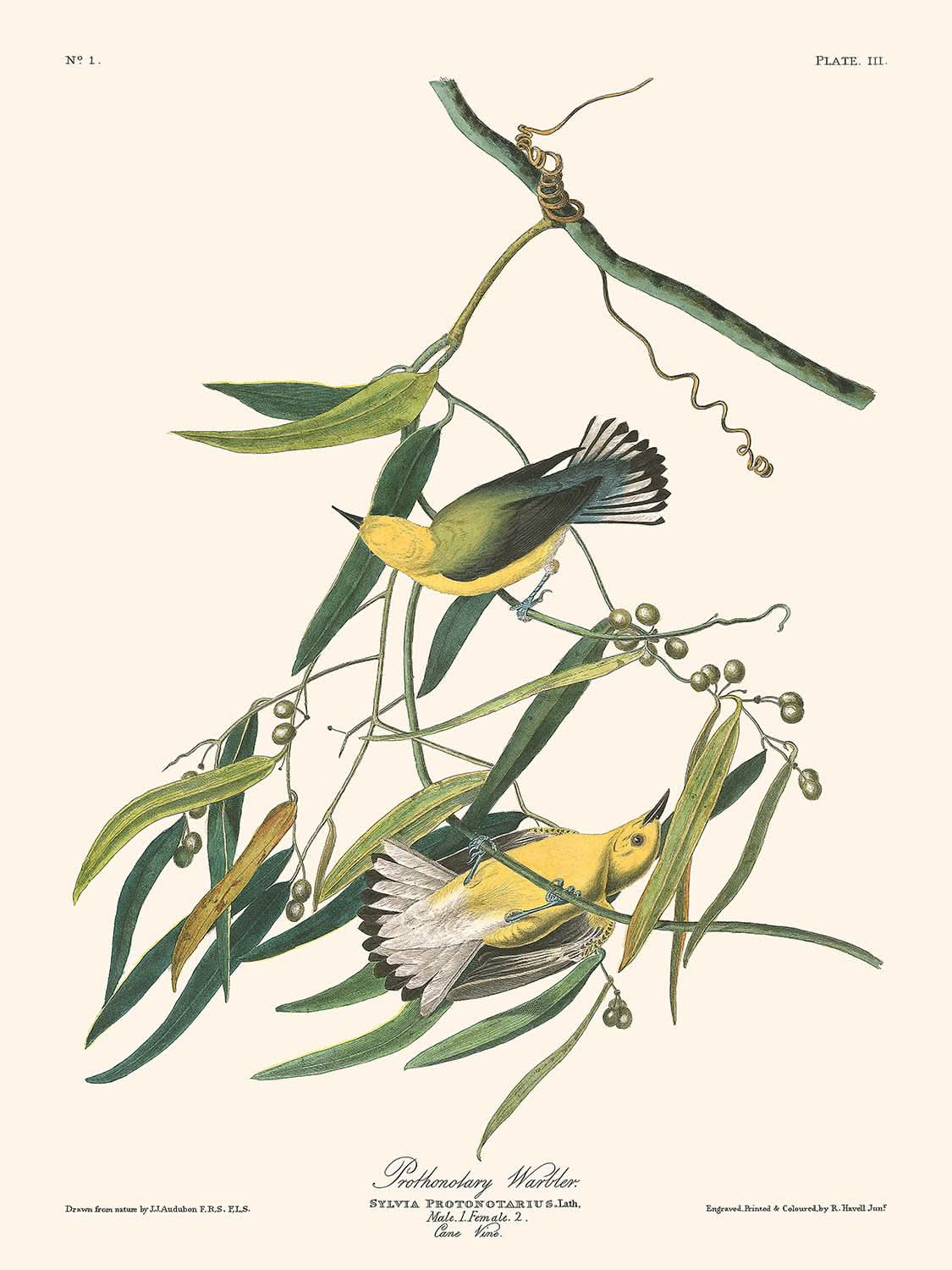 The Prothonotary Warbler illustration stands out for its precise use of color and skillful composition. Audubon brings to life the radiant yellow and green hues of the warbler, complemented by the natural setting that envelopes the bird. The verdant reeds and soft blue-grey tones of the background echo the warbler's serene musical notes in its natural swamp-like habitat, making this print a window to the serene waters and lush landscapes where these warblers thrive.