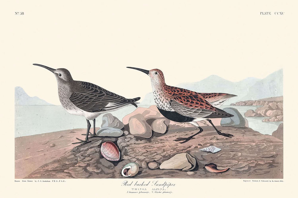 Red-backed Sandpiper, first published in 1827, is a mesmerizing bird illustration from John James Audubon's celebrated series, The Birds of America. This exquisite piece captures the rich autumnal colors of the Red-backed Sandpiper, or Tringa alpina, showcasing Audubon’s exceptional ability to bring each bird to life with vivid detail and dynamic composition.