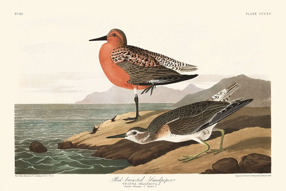 John James Audubon is celebrated for his keen observations and artistic prowess, which allowed him to capture the intricate details and vibrant plumage of birds. The Red-breasted Sandpiper is no exception—this illustration transports the viewer into the vivid world of coastal habitats the Knot frequents during its migratory journeys.