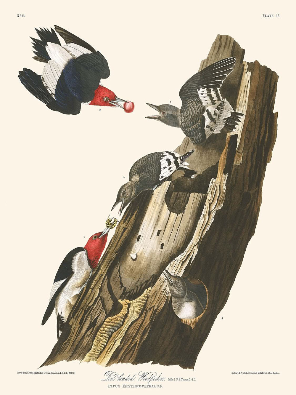 This artwork is notable for its portrayal of the Red-headed Woodpecker (Picus erythrocephalus), known for its striking red head and contrasting black and white body, which Audubon captures with striking realism. The bird's behavior and habitat are depicted with vivid clarity, inviting viewers into a moment in time within the American wilderness.
