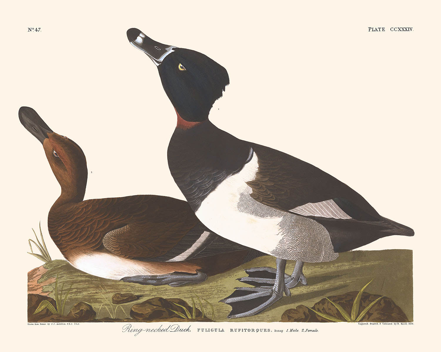 The "Ring-necked Duck" by John James Audubon, firstly presented in 1827, is an exemplary work of ornithological artistry, capturing the distinct elegance and dynamic presence of this duck species. Audubon, renowned for his meticulous documentation in "Birds of America," offers viewers insight into the avian life through both artistic skill and scientific precision. In this particular piece, one of the charms lies in the exquisite detailing which illuminates characteristics making the Ring-necked Duck distinguishable and noteworthy within various environments across North America.