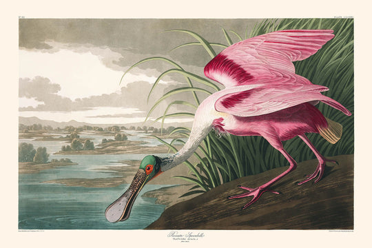 The artwork features the Roseate Spoonbill (Platalea ajaja), a species recognized for its striking combination of delicate pink and white hues. The use of these colors creates a vibrant yet harmonious composition, emphasizing the bird's distinctive form and elegant movements. Audubon's depiction delights with intricate detailing, such as the unique spoonshaped bill and red accents on the tips of the wings, which capture the mesmerizing grace of this gregarious wader. As you observe the print, you'll be transported into coastal marshes, where these birds wade gracefully through the shallows in search of sustenance.
