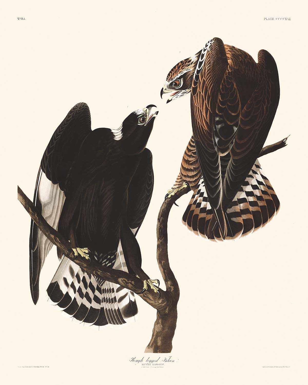 Immerse yourself in the world of ornithological beauty with the "Rough-legged Falcon" by the renowned naturalist and artist John James Audubon. Created in 1827 as part of Audubon's masterpiece series, "Birds of America," this exquisite illustration captures the majestic Rough-legged Falcon in its natural splendor. Audubon, celebrated for his meticulous attention to detail and lifelike depictions of birds, presents the falcon perched gracefully amid the serene embodiment of its native habitat.