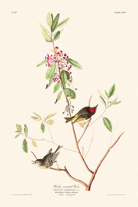 Audubon was a significant figure in early American art and science, bridging both with his uniquely lifelike portrayals of birds. Known for his revolutionary naturalist contributions, Audubon's work remains a cornerstone of ornithological study and visual art. The "Ruby Crowned Wren" stands out not only as a visually appealing piece but also for its noteworthy subject – a petite bird with a song richer than that of a canary.