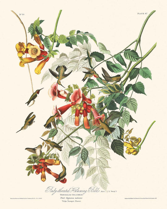 Ruby-throated Humming Bird (Plate 47) by John James Audubon, a captivating bird illustration, originates from the iconic collection, Audubon’s Birds of America, published in 1827. This masterpiece provides an intimate glimpse into the mesmerizing world of the Ruby-throated Hummingbird in its natural habitat, highlighting Audubon’s dedication to illustrating the beauty and diversity of American birdlife.