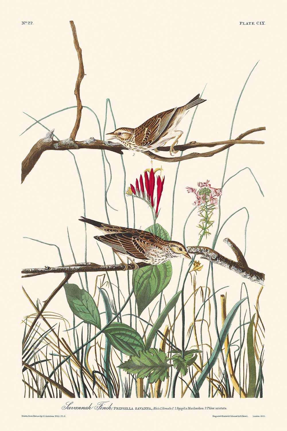 Audubon, a legendary ornithologist and artist, gained international acclaim for his lifelike and captivating illustrations of birds. His work on "The Birds of America" not only highlighted his artistic skill but also provided invaluable scientific observations. The Savannah Finch, featured prominently in this plate, reflects Audubon's passion for documenting the diversity and behaviors of American bird species.