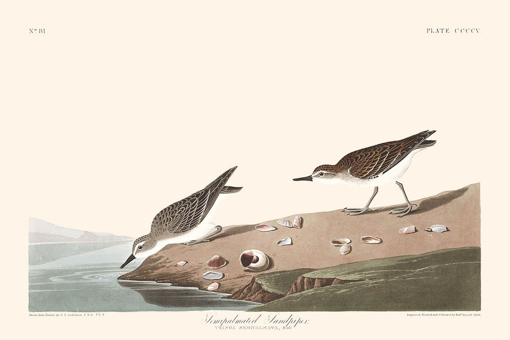 John James Audubon's "Semipalmated Sandpiper" is a captivating illustration from the esteemed "Birds of America" series, produced in 1827. This delicate yet detailed artwork beautifully portrays the semipalmated sandpiper (Tringa semipalmata), a migratory bird noted for its brisk movement along North America's shores and rivers.