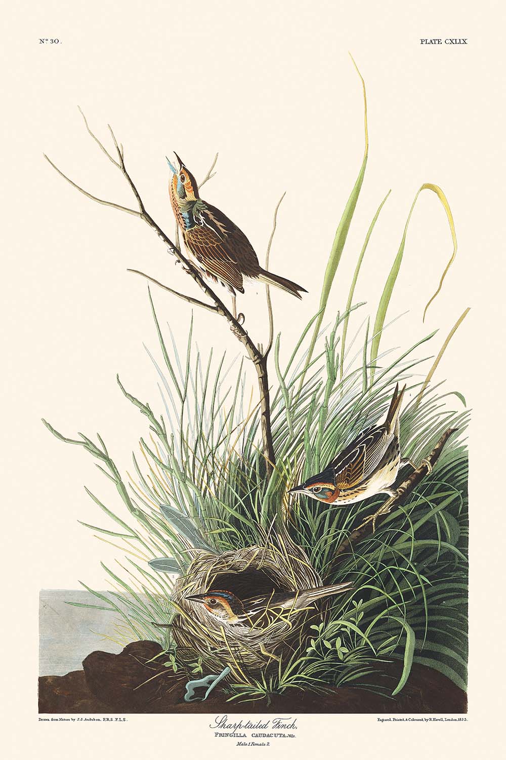 John James Audubon's "Sharp-tailed Finch" from his illustrious 1827 collection, "Birds of America," showcases the extraordinary precision and in-depth observation of a master ornithologist and artist. This piece highlights the intricate life of the Sharp-tailed Finch (Fringilla caudacuta), depicted during its annual winter travels to the salt marshes of South Carolina. The intricacies captured not only speak to the Finch's delicate anatomy but also to its ecological behaviors documented during Audubon's time.
