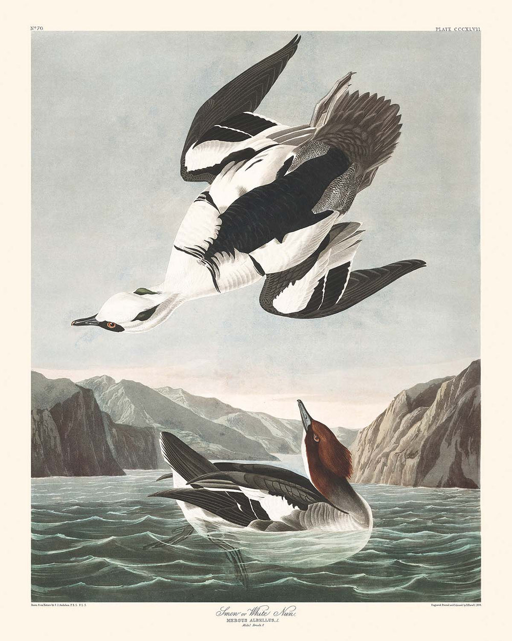 The artwork stands out with a color palette that predominantly features dazzling whites and deep blacks, interspersed with shades of duck-green and grey, which highlight the birds in a strikingly lifelike manner. Audubon's attention to detail shines through, especially in the refined plumage of the Smew, depicted with precision and vitality. This piece is a splendid example of Audubon's ability to blend artistic mastery with scientific illustration, making it a must-have for bird and art enthusiasts.