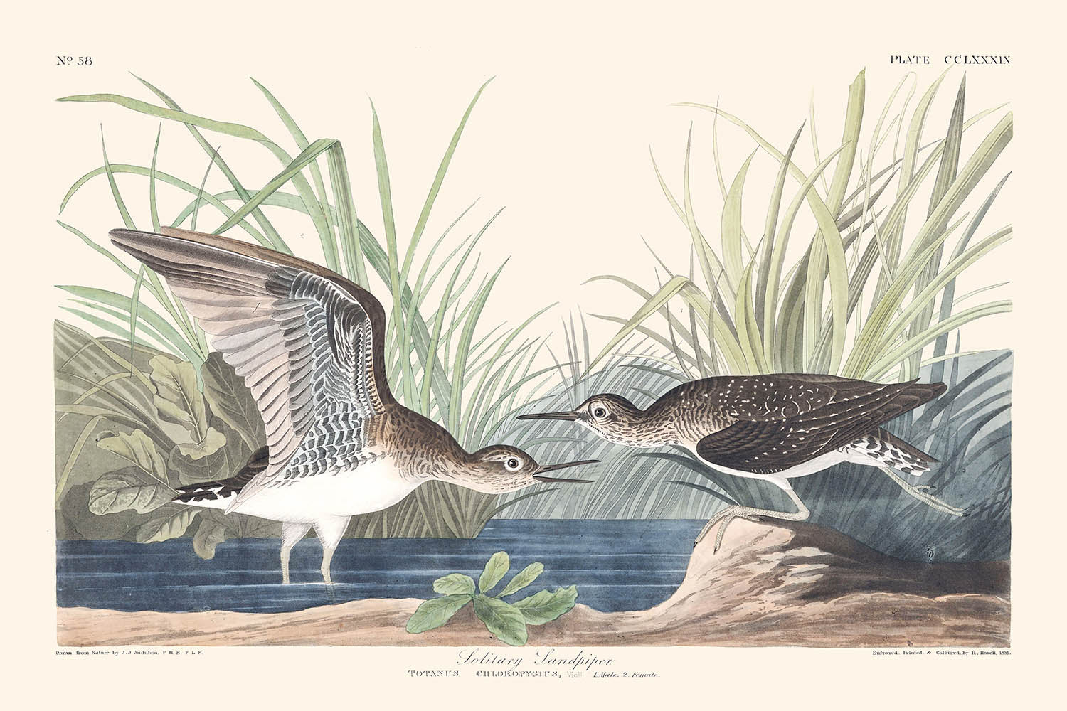 Audubon's "Solitary Sandpiper" offers a compelling perspective on avian life, blending accurate scientific prose with on-point artistic flair. The bird's soft plumage and the intriguing pattern of greyish-brown and white mark this piece as a worthy addition to any collection. The intermingling tones and meticulous details appeal to both ornithology enthusiasts and lovers of fine art.