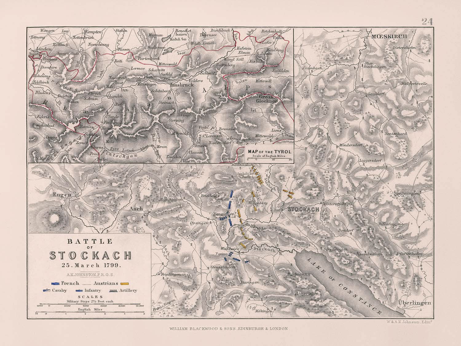 Explore the rich tapestry of history with "Battle of Stockach" by AK Johnston, an intricate antique colour lithograph depicting the pivotal skirmishes of 1799. Engraved by the distinguished W. & A.K. Johnston in Edinburgh, this detailed battle map is a true testament to historical cartography. A special feature of this artwork includes an inset map of the Tyrol, showcasing the strategic positions held by the French and Austrian armies, complete with cavalry, infantry, and artillery denoted.