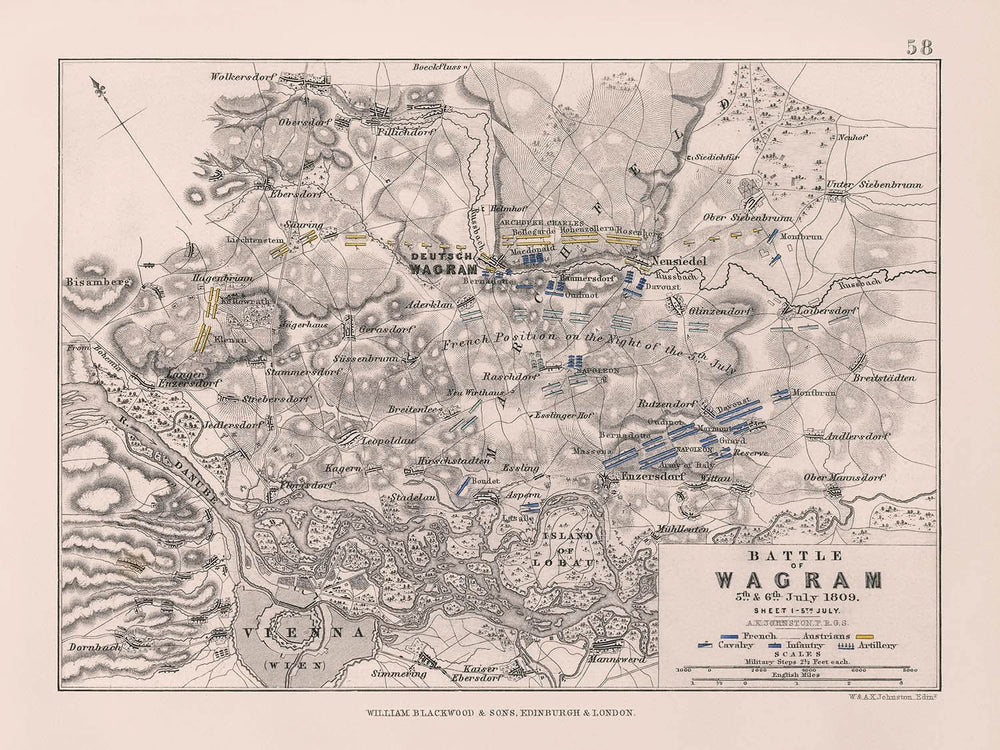 Introducing the historical artwork "Battle of Wagram, 5 & 6 July 1809: sheet 1- 5 July," crafted by the notable artist AK Johnston in 1809. This antique work is an engraved hand-colored battle plan derived from an atlas accompanying Alison's History of Europe, depicting a prominent engagement of the Napoleonic Wars. Highlighting the French Revolution era, this detailed map showcases the strategic positions of French and Austrian forces. The artwork is marked by the creator, W. & A.K. Johnston, Edinr.