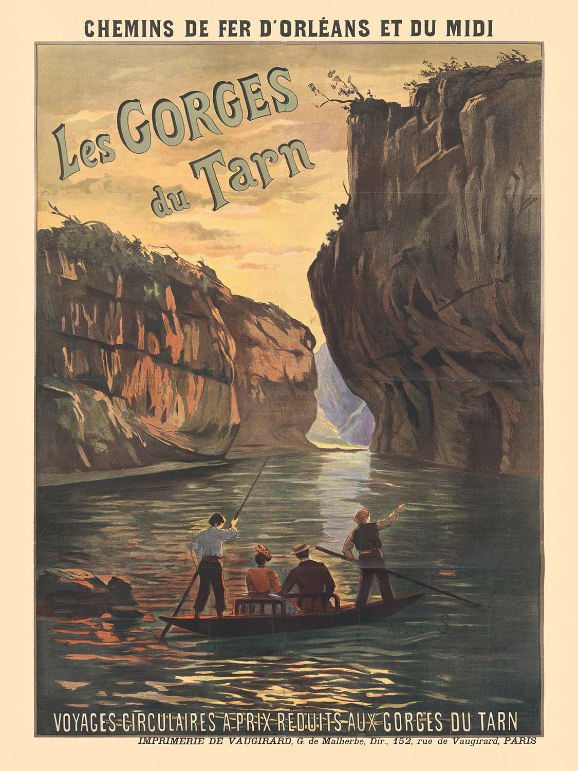 Les gorges du Tarn by André Suréda (1910) is a luminous celebration of France’s great river canyon in the south, where the Tarn winds between sheer limestone walls and quiet, stone-built villages. Created at the height of Europe’s early tourism boom, this antique travel poster invites the viewer into a tranquil passage of water and light: a slim boat glides past towering cliffs, the figures onboard dwarfed by nature’s scale. It belongs to the era when Art Nouveau–inflected posters fused realism with decorative rhythm to tempt travelers toward scenic escapes by rail and river.
