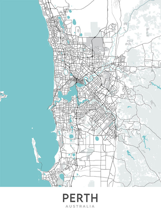 This map of Perth is a modern and detailed cartographic artwork that focuses on the urban sprawl of the city center and its surrounding suburbs. The map is centered on the central business district (CBD), which is home to many of the city's most iconic landmarks, including the Perth CBD, Kings Park and Botanic Garden, and the University of Western Australia. The CBD is also a major transportation hub, with several train and bus stations located within its boundaries.