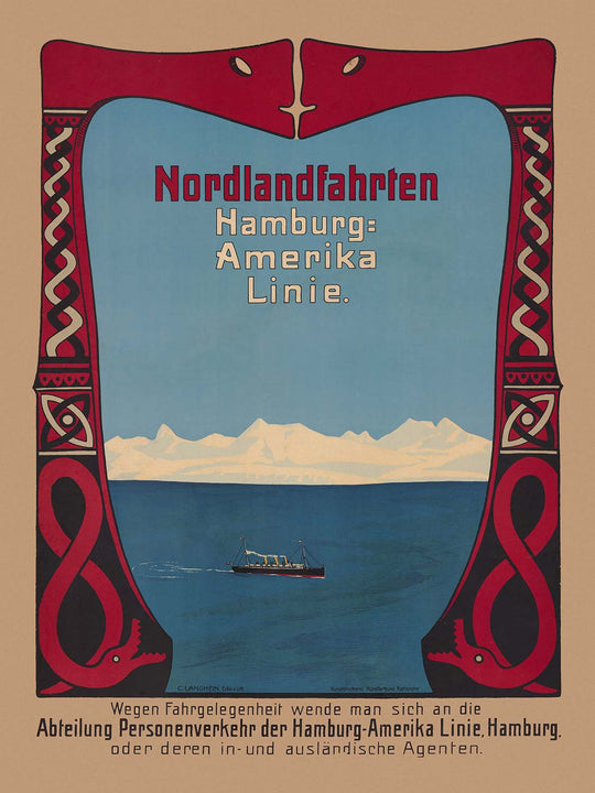 The subject here is especially compelling for lovers of Scandinavia and the North Atlantic. “Nordlandfahrten” tours promised sweeping Norwegian fjords, glacial light, and the exhilaration of long summer days near the Arctic Circle. By linking Hamburg with the “Nordland” coasts, the Hamburg-Amerika Linie helped popularize leisure cruising, reflecting a moment when exploration and modern comfort converged. The poster’s German wording—Nordlandfahrten and Hamburg-Amerika Linie (often abbreviated HAPAG)—anchors it in that history and makes it a conversation piece for travelers who have sailed the fjords or stood at the North Cape.