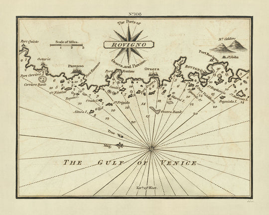 Heather's chart is a masterpiece of nautical cartography, featuring a prominent compass rose and a detailed scale bar that enhances its practical utility for seafarers of the time. The map's focus on the harbors—such as Port Rovigno, Port Orsera, and Port Parenso—highlights their importance in maritime trade and defense. The inclusion of smaller ports and anchorages along with detailed coastal topography, such as the depiction of the Učka mountain range and the Motovun Forest, reflects Heather's commitment to providing comprehensive navigational information.