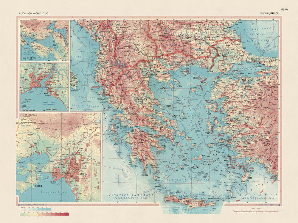 Old Map of Albania and Greece, 1967: Athens, Istanbul, Gulf of Kotor, Detailed Political Divisions & Physical Terrain
