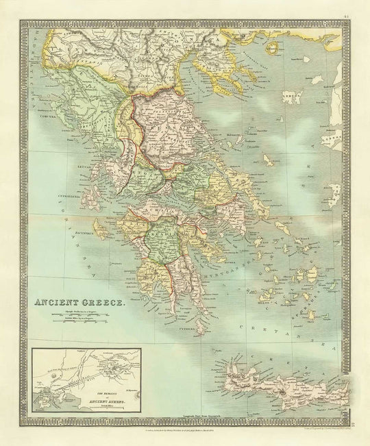 A beautiful old map of Ancient Greece, published by Henry Teesdale in 1834, with a delightful 'piano key' border.