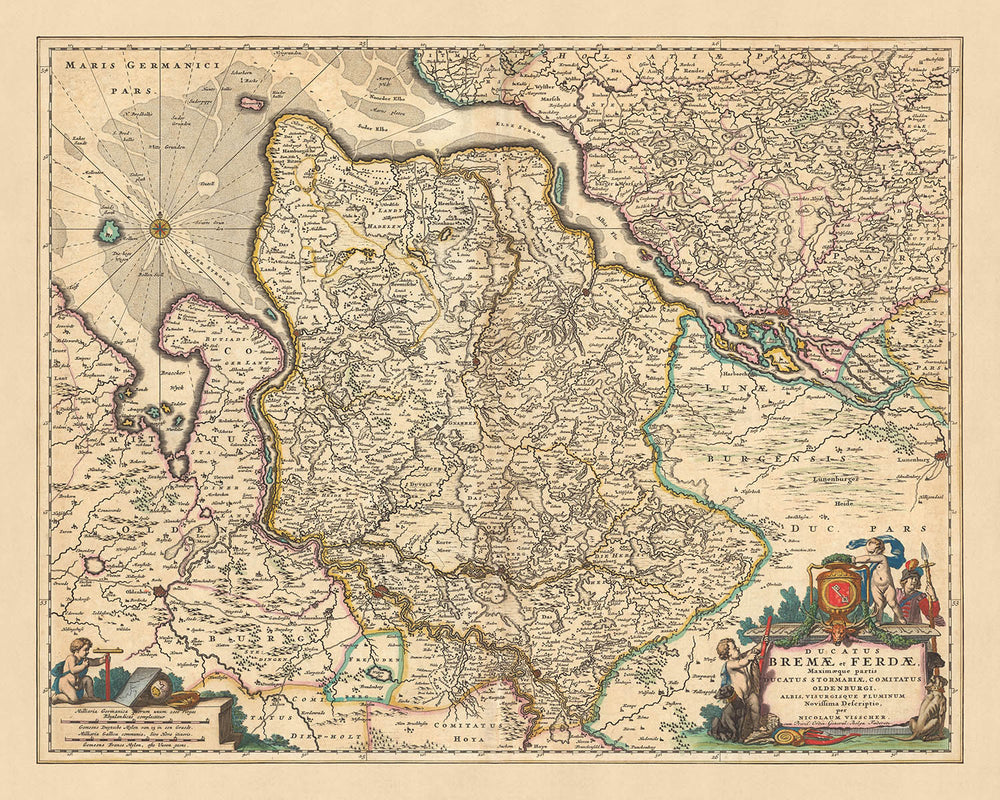 Dive into the rich history of Northern Germany with this meticulously detailed map by Nicolaes Visscher II, a renowned mapmaker from the Dutch Golden Age. Created in 1690, this map, officially titled 'Ducatus Bremae et Ferdae, Maximaeque partis Ducatus Stormariae, Comitatus Oldenburgi, Albis, Visurgisque Fluminum Novissima Descriptio', focuses on the regions of Bremen and Verden, with notable features including the cities of Hamburg, Oldenburg, Lüneberg, Bremerhaven, and Stade.