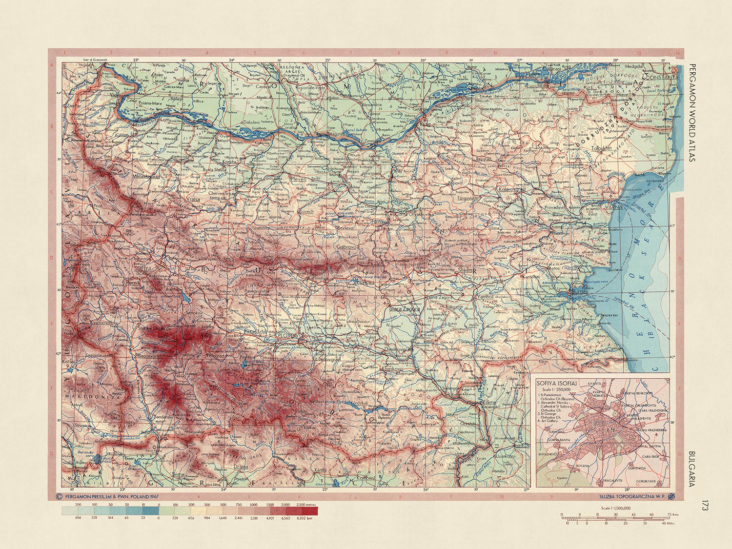 This exceptional piece, titled 'Bulgaria', is a testament to the meticulous craftsmanship of the Polish Army Topography Service, its original publisher in 1967. As a national country map, it encapsulates the rich geographical and political landscape of Bulgaria in remarkable detail. The primary focus of the map is Bulgaria, but it also encompasses the larger geographical region around it, offering a comprehensive view of the country's position in relation to its neighbors. The map stands out not only for its precise depiction of political boundaries and physical features but also for its attention to detail, which brings the map to life.
