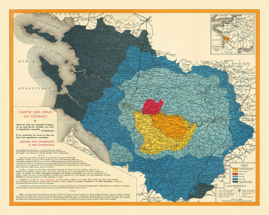 Historically, this map is significant as it captures a snapshot of the Cognac region during a time when the wine industry was gaining international prominence. The map's detailed classification system reflects the meticulous standards and traditions that have long been associated with Cognac production. For collectors and enthusiasts, this map is not only a piece of art but also a valuable historical document that offers insights into the evolution of one of France's most cherished exports.