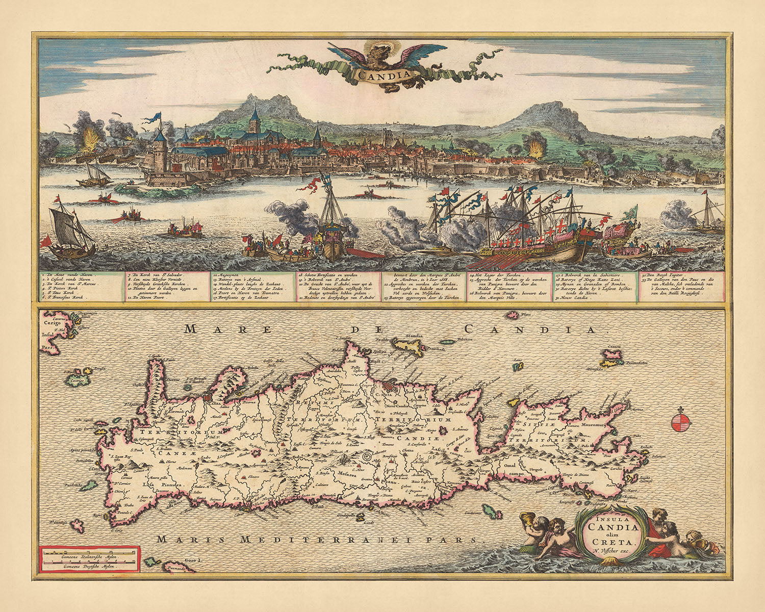 What sets this map apart is the detailed view at the bottom, illustrating the Turkish siege of Candia. A key, thoughtfully placed at the bottom, aids in locating 33 points of interest, allowing the viewer to delve deeper into the historical context of the region. From cities and towns to waterways and canals, every aspect of the landscape is represented, providing a comprehensive overview of Crete during this period.