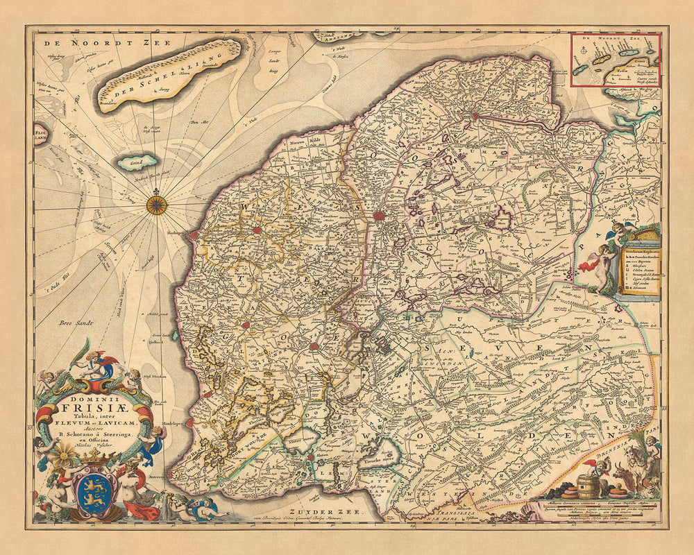 Old Map of Friesland by Visscher, 1690: Leeuwarden, Drachten, Heerenveen, Sneek, De Alde Feanen National Park
