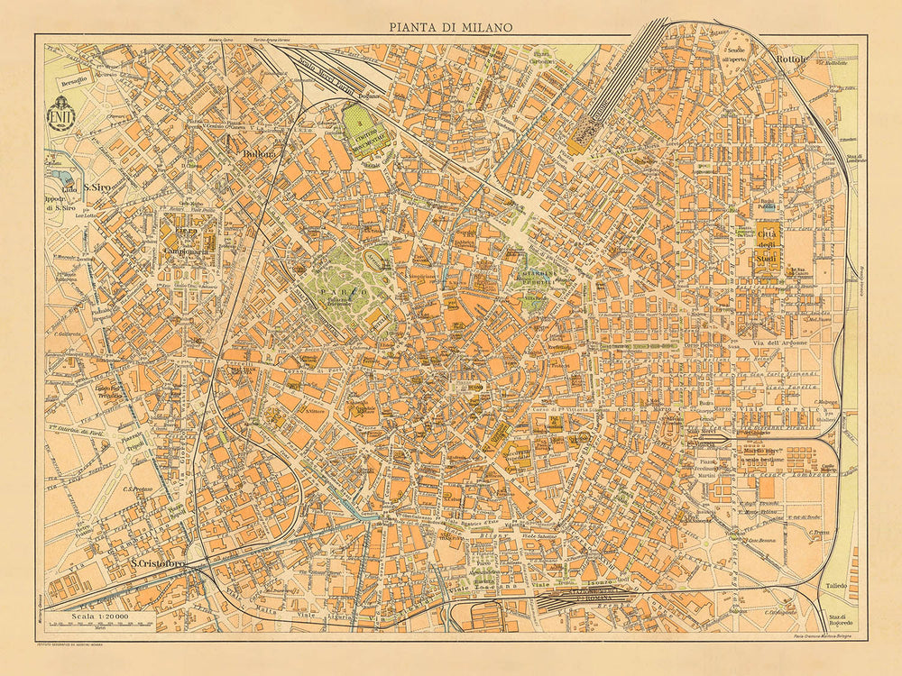 The 'Pianta di Milano,' a city map published in 1935 by Instituto Geographico de Agostini-Novara, is a fascinating historical document that offers a detailed view of Milan during a transformative period in its history. This street map is unique in that it captures the city's architectural and geographical features in a period of significant political and social change, the Fascist era. It meticulously illustrates the city's intricate network of streets, revealing the urban planning strategies of the time. The map also includes several landmarks, neighborhoods, and other notable features, making it a captivating piece of historical art.