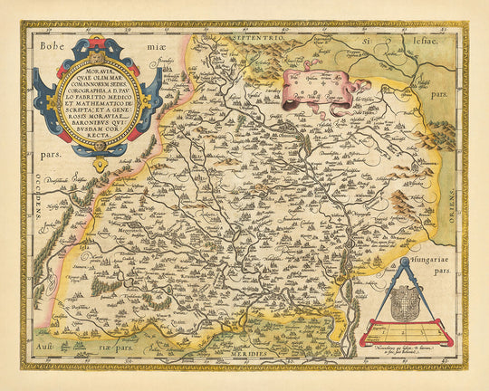 The "Moraviae, Quae Olim Marcomannorum Sedes Corographia" is a captivating cartographic masterpiece created by the esteemed Flemish cartographer Abraham Ortelius in 1608. This map, part of Ortelius' groundbreaking "Theatrum Orbis Terrarum," the first modern atlas of the world, is a testament to the rich history and geographical intricacies of the Moravian region. Ortelius, renowned for his meticulous attention to detail and artistic flair, has masterfully depicted the political and physical landscape of Moravia, showcasing fortified cities, towns, and natural features with remarkable precision and elegance.