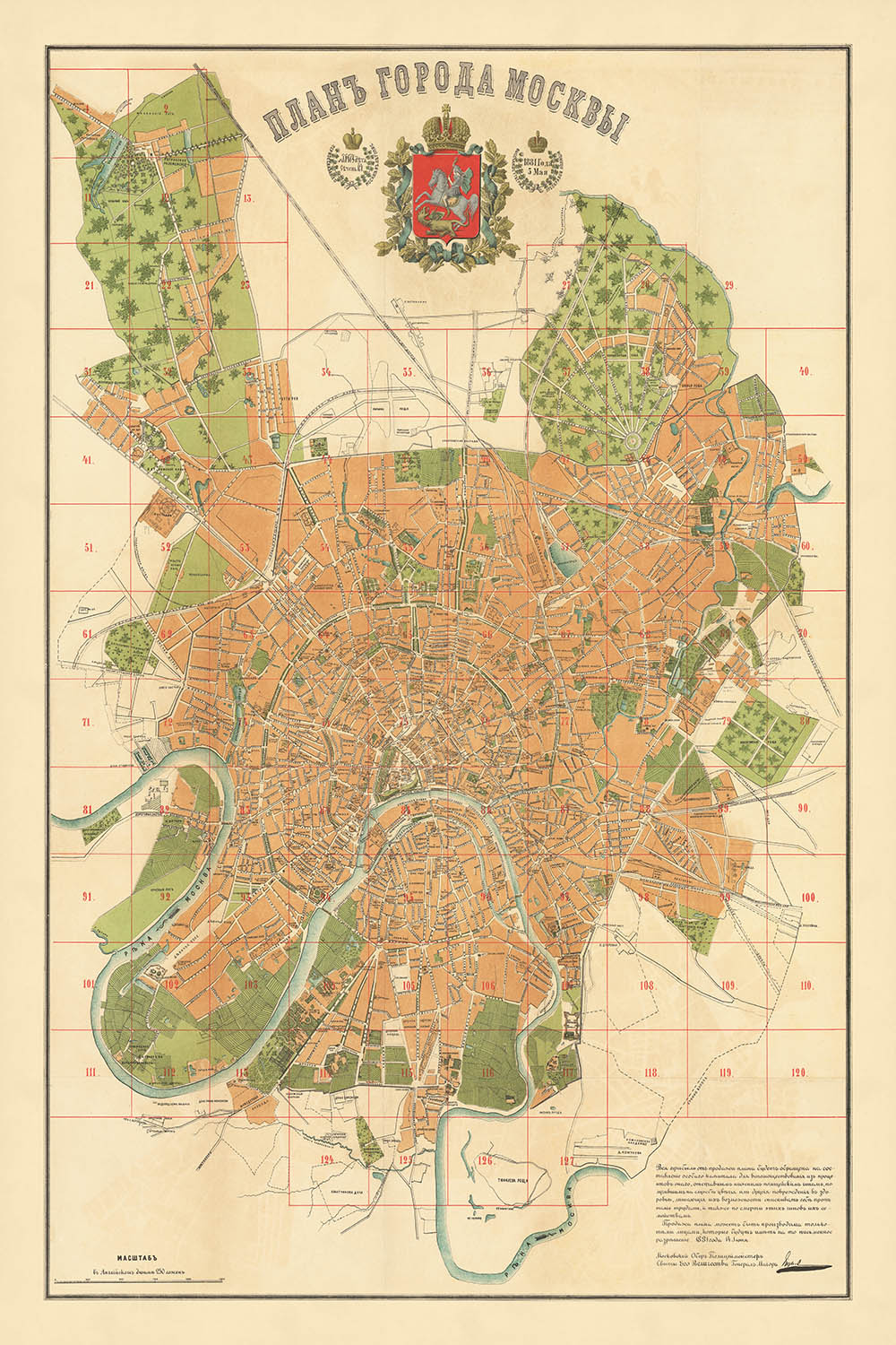 The "Планъ Города Москвы" (Plan of the City of Moscow) is a masterful representation of Moscow as it stood in 1881. This exquisite map, signed by the Major General in charge of the Moscow City Police, offers a fascinating glimpse into the city's rich history and urban layout. The map is adorned with the Coat of Arms of Moscow, featuring the iconic image of St. George slaying the dragon, a symbol of the city's resilience and storied past. This detailed, color-printed map divides Moscow into a grid of 127 sections, providing an intricate view of the city's streets, parks, and significant landmarks.
