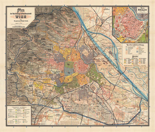Venture back to the cusp of the 20th century with this exquisite map showcasing the grandeur of Vienna. Expertly crafted by Gustav Freytag in 1895, this piece not only encapsulates the intricate street layouts and architectural wonders of the time, but it also unveils the heart and soul of a city on the brink of monumental change. Drawing focus to Vienna's vibrant districts like Innere Stadt and Leopoldstadt, the map provides enthusiasts and historians alike an opportunity to traverse the past streets of a European jewel.