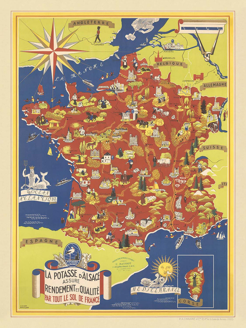 Across the map, France’s great cities and towns are marked—Paris, Marseille, Lyon, Bordeaux, Strasbourg, and many more—each a hub of culture, commerce, and history. Their placement invites the viewer to imagine the spread of agricultural innovation from the fields of Alsace to every corner of the country. This map is not only a testament to the ingenuity of its era but also a celebration of the enduring relationship between land, people, and the promise of prosperity. For collectors and connoisseurs alike, it offers a window into a pivotal moment in French history, rendered with all the charm and detail that only Lucien Boucher could provide.