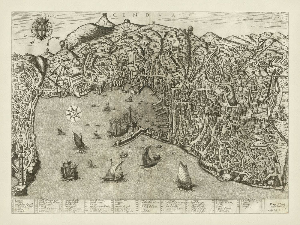 - Birds-eye view highlighting Genoa’s harbor and topographical features.