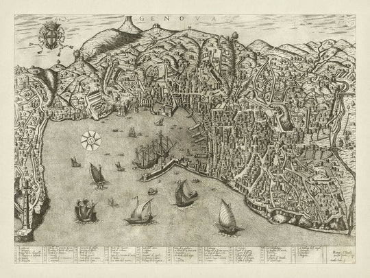 Immerse yourself in the intricate urban landscape depicted on this map, where winding streets and bustling neighborhoods reveal the vibrant life of Renaissance Genoa. The map's legend, listing 58 places of interest, serves as a guide to the city's architectural and cultural landmarks. From grand cathedrals to bustling marketplaces, each location tells a story of Genoa's rich and diverse heritage. This map not only serves as a historical document but also as an artistic celebration of the city's unique character.