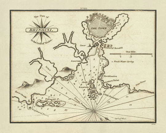 "The Port of Brindisi, in the Gulf of Venice" is a remarkable nautical chart created by the esteemed British naval officer and hydrographer, William Heather, in 1802. This map is not merely a navigational aid but a historical artifact that captures the strategic importance of Brindisi, a city that has been a nexus of maritime and military activity through various epochs. The map is drawn in a traditional nautical style, detailed with symbols and abbreviations that offer a comprehensive view of the coastal topography and maritime routes.