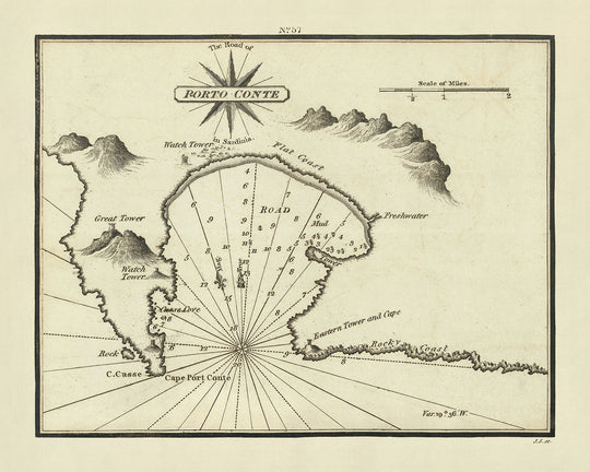 Heather's chart is a treasure trove of nautical detail, showcasing soundings (depth measurements in fathoms), which are crucial for safe navigation. The depiction of the coastline is complemented by annotations of the Great Tower, the Watch Tower, and the Eastern Tower, serving as vital landmarks for sailors. These features are not merely functional but are also rendered with an aesthetic precision that makes the chart as beautiful as it is useful. The inclusion of navigational aids like a compass rose and indications of water currents further underscores the chart’s practical application during its time.