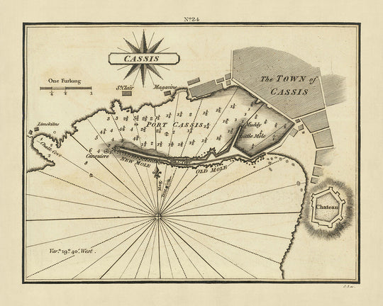 Introduction to the Map's Historical and Artistic Merit "A Plan of the Town and Port of Cassis," crafted by the esteemed British hydrographer William Heather in 1802, stands as a remarkable artifact of cartographic history. This chart, a product of Heather's ambitious project, The New Mediterranean Pilot, captures the intricate details of Cassis, a picturesque town nestled on the Côte d'Azur in France. Unlike earlier Mediterranean charts of French and Italian origin which were relatively rudimentary, Heather's chart is celebrated for its meticulous engraving, a testament to the advanced British cartographic techniques of the early 19th century.