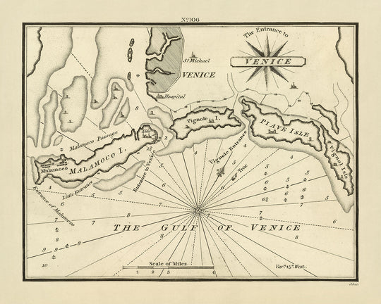 Beyond its historical value, "The Entrance to Venice" is a marvel of design and functionality. The chart’s navigational aids, such as compass roses, currents, and water channels, are not only practical but are presented with an aesthetic finesse that appeals to connoisseurs of both maritime history and cartographic art. The simple yet functional style of the map, combined with its detailed soundings and topographical features, reflects a period when maritime charts were pivotal to exploration and trade.