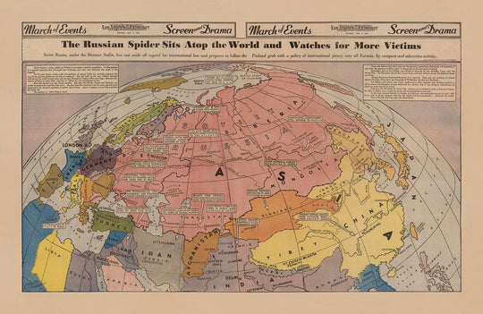 The title of the map is "The Russian Spider Sits Atop the World and Watches for more Victims", and the map has been cleverly drawn from a perspective where Russia does indeed look like a giant spider that wants to gobble up Europe and Asia.