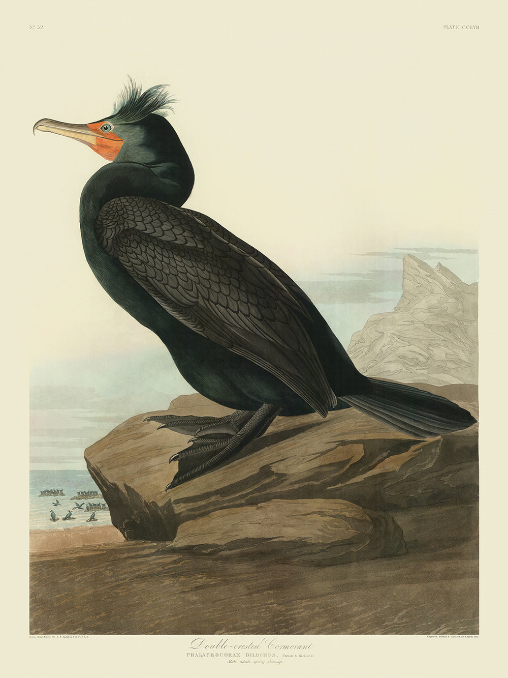 Double-crested Cormorant, first published in 1827, is an exceptional representation from John James Audubon's monumental work, The Birds of America. This meticulously detailed illustration captures the Double-crested Cormorant in all its splendor, highlighting the bird's distinctive spring plumage.