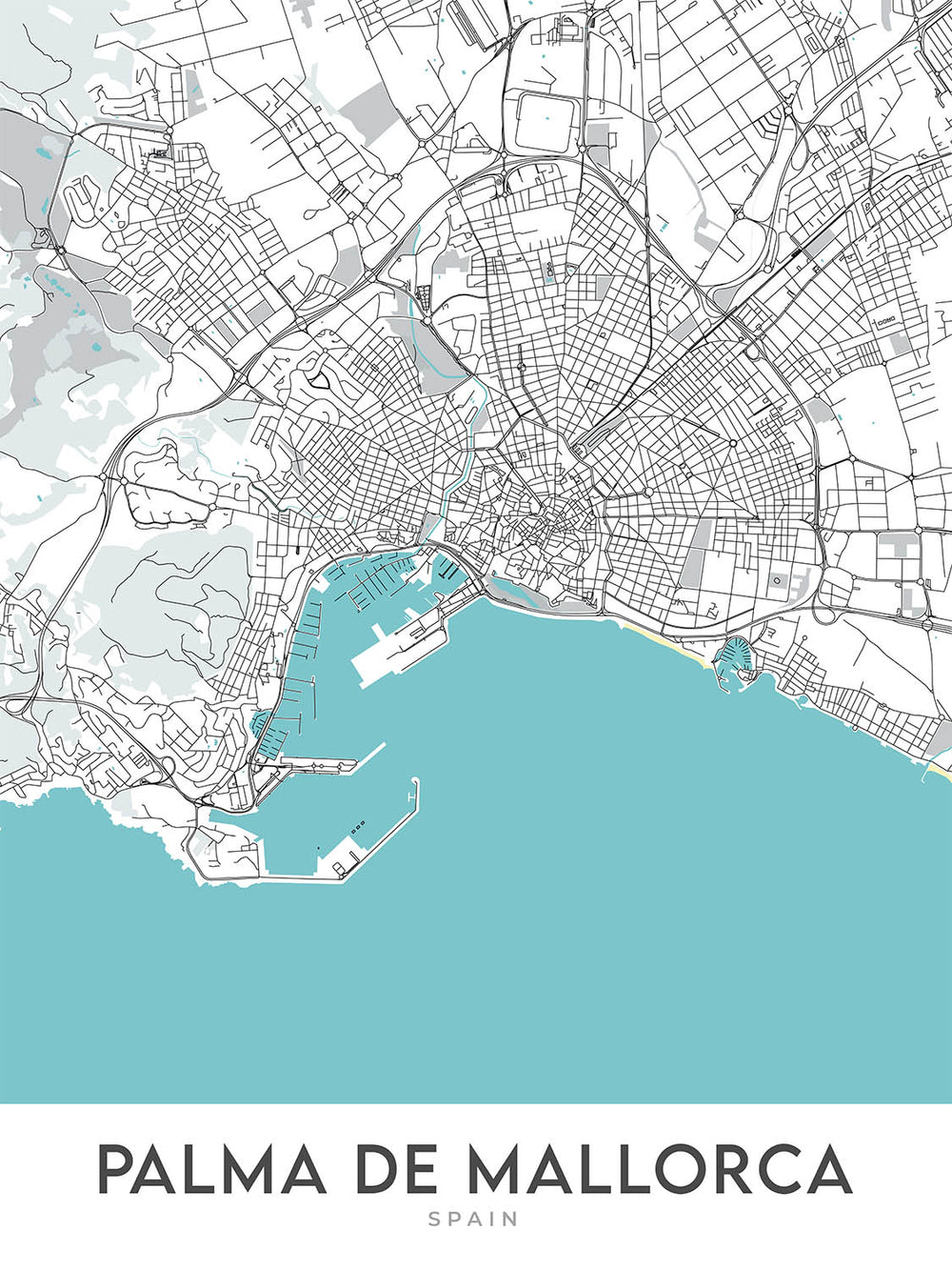 This map of Palma de Mallorca, the vibrant capital city of the Spanish island of Mallorca, is a modern cartographic masterpiece that captures the essence of this Mediterranean gem. With its focus on contemporary design and aesthetics, this map is a stylish addition to any home or office, offering a unique perspective on one of Europe's most captivating cities.