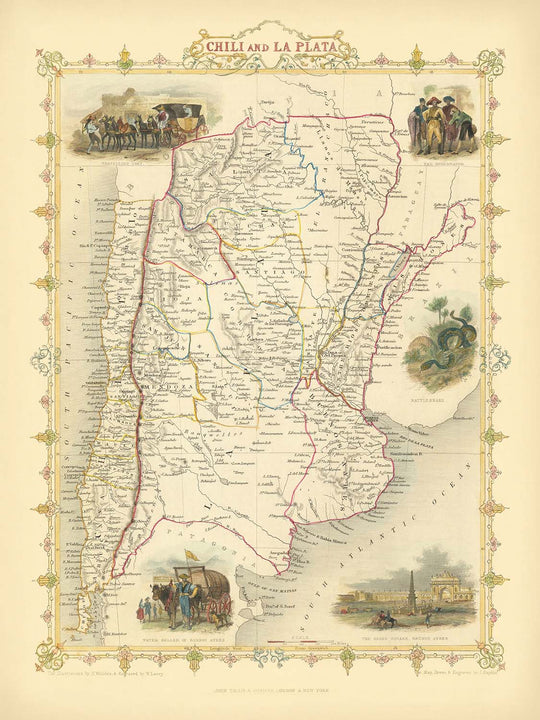 Step into the world of mid-19th century cartography with John Tallis's exquisite "Chili and La Plata" map, crafted in 1851. Tallis, celebrated as one of the last great decorative mapmakers, infused his work with artistry and precision, making his maps highly sought after by collectors. This map captures the geographical and political landscape of northern Argentina and central Chile, offering a glimpse into the past with its intricate details and vibrant vignettes. The map's ornate borders and illustrative elements elevate it beyond a mere navigational tool to a piece of art.