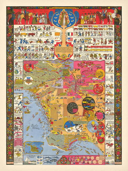 Jo Mora, a master of many artistic disciplines, crafted this map with an eye for both detail and storytelling. His background as a sculptor, painter, and historian is reflected in the map's vivid illustrations and historical timeline. Mora's work is renowned for its ability to capture the essence of a place, and this map is no exception. It serves as a testament to his deep understanding of Los Angeles, highlighting its diverse culture and history through artistic expression.