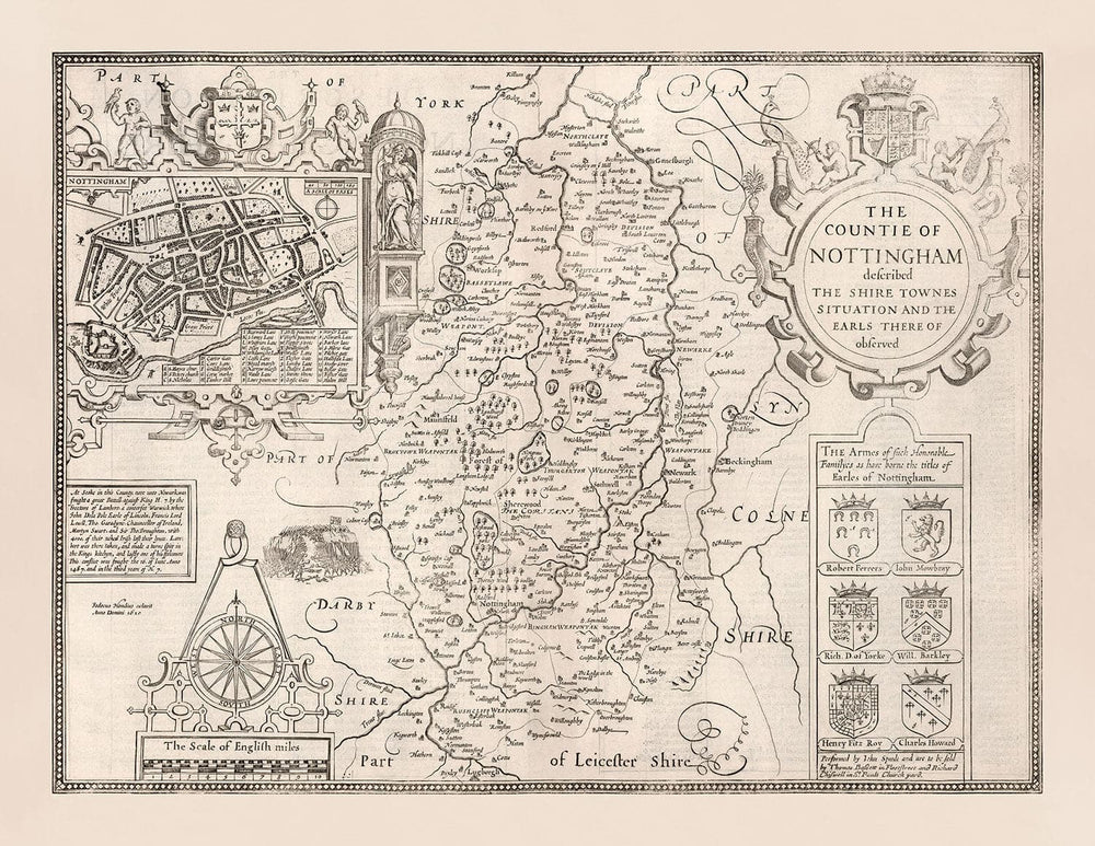This old, monochrome and wonderful map shows the ancient county of Nottinghamshire in 1611. It was created by John Speed and engraved by Jodocus Hondius, and originally published in Speed's "The Theatre of the Empire of Great Britaine".