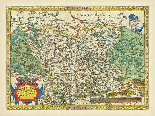 The "Saxoniae, Misniae, Thuringiae, Nova Exactissimaque Descriptio," crafted by the renowned cartographer Abraham Ortelius in 1595, is a remarkable artifact from the golden age of cartography. Ortelius, a Flemish geographer, is celebrated for his pioneering work, "Theatrum Orbis Terrarum," the first modern atlas of the world. This map is a testament to his meticulous craftsmanship and his dedication to providing a comprehensive view of the world as it was known in the late 16th century. The map extends from Prague to Berlin and Brandenburg, capturing the essence of Central Europe with an exceptional old color scheme that brings the historical landscape to life.