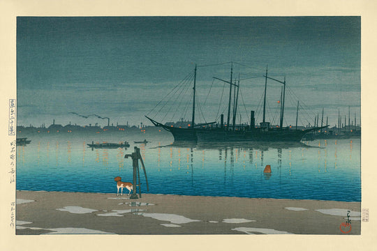 "After The Rain At Akashi Town" by Hasui Kawase is a captivating woodblock print, created in 1935, that beautifully captures the serene essence of post-rain tranquility in Akashi Town. Hasui Kawase was an influential artist in the Shin-Hanga movement, known for revitalizing traditional ukiyo-e prints with modern styles and Western influences. His works are revered for their serene beauty, distinct palate, and subtle interplay of light and shadow.